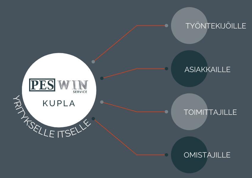 Peswin vastuullisuuskuplassa on kyse meistä ja meidän sidosryhmistä. Vastuullisuuskuplan sisällä olevat asiat ovat meidän toimintamme prioriteetti. Näihin kohdistuu erityisesti REILUUS kaikessa mitä teemme.